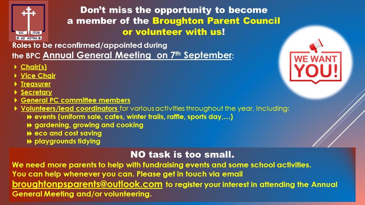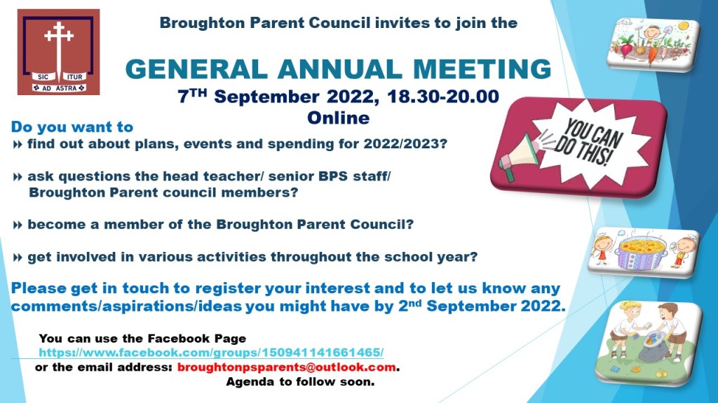 The AGM for our Parent Council is on Wednesday 7th September from 6.30-8pm.
